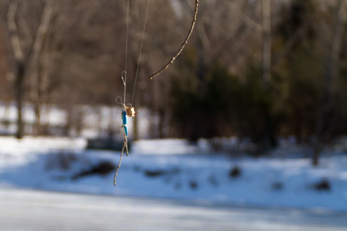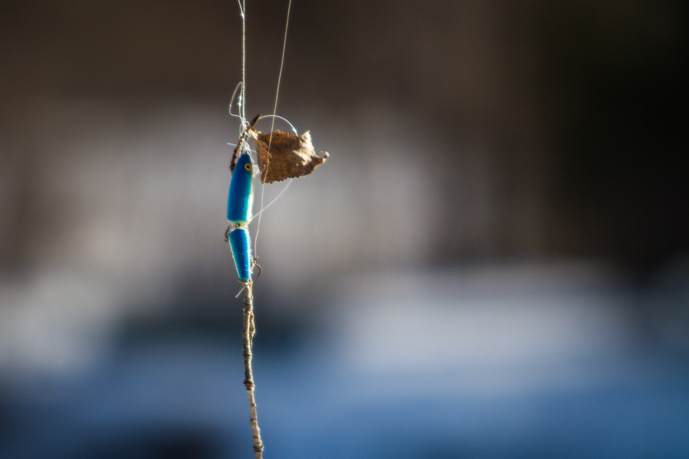Un leurre pour la pêche au lancer. Pris dans les arbres.  Je n’ai pas pu m’empêcher d’imaginer ce qu’a pu dire le pêcheur en voyant son fil pris et hors de portée.