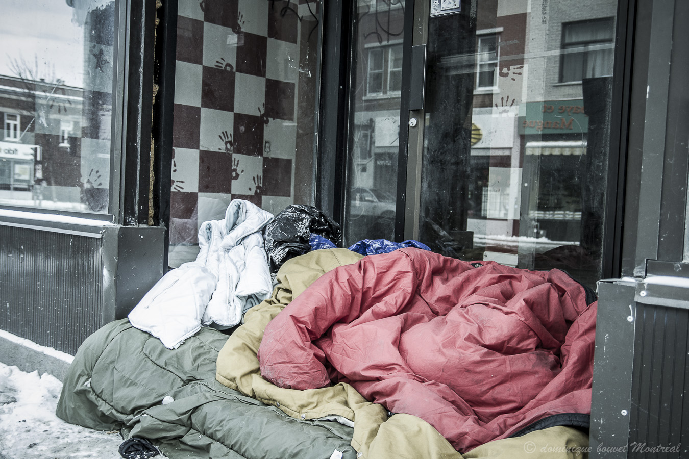 C’était le 7 février sur la rue Ontario Est à Montréal, à 11 du matin. La nuit, le thermomètre était sans doute descendu en bas de -20°. J’ai du mal à admettre que pendant que des politiciens font de la petite politique pour soigner leurs gros égos , que des magouilleux s’en mettent plein les poches, des êtres humains puissent dormir dehors.