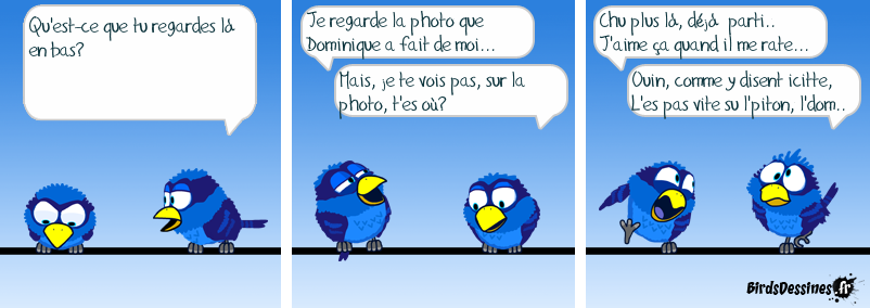 Ils sont drôles! mais le Dom a été assez vite su l’piton pour pogner une coup’ de graines en l’air … comme de quoi, il l’a vraiment raté ce zosio 😉