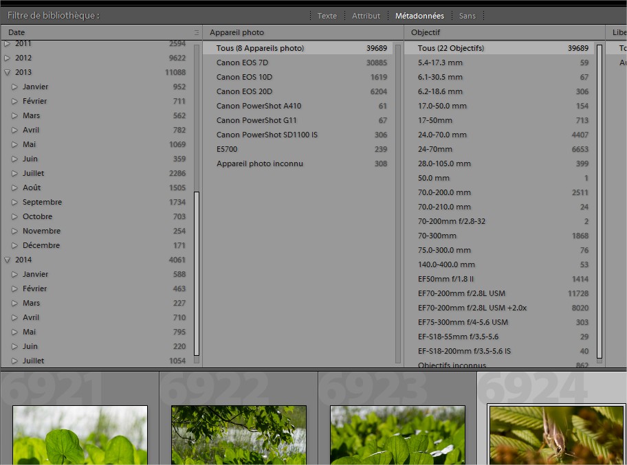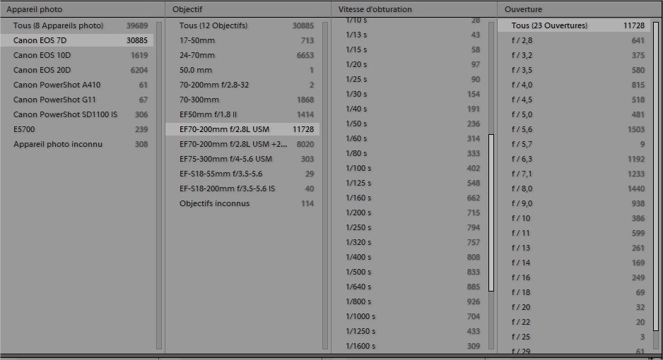 Ps, Lightroom, c’est vraiment un outil fantastique.  Capable en lisant les métadonnées ( données que l’appareil photo enregistre lors de la prise de vue) d’un dossier contenant près de 40 000 images de vous sortir ça: