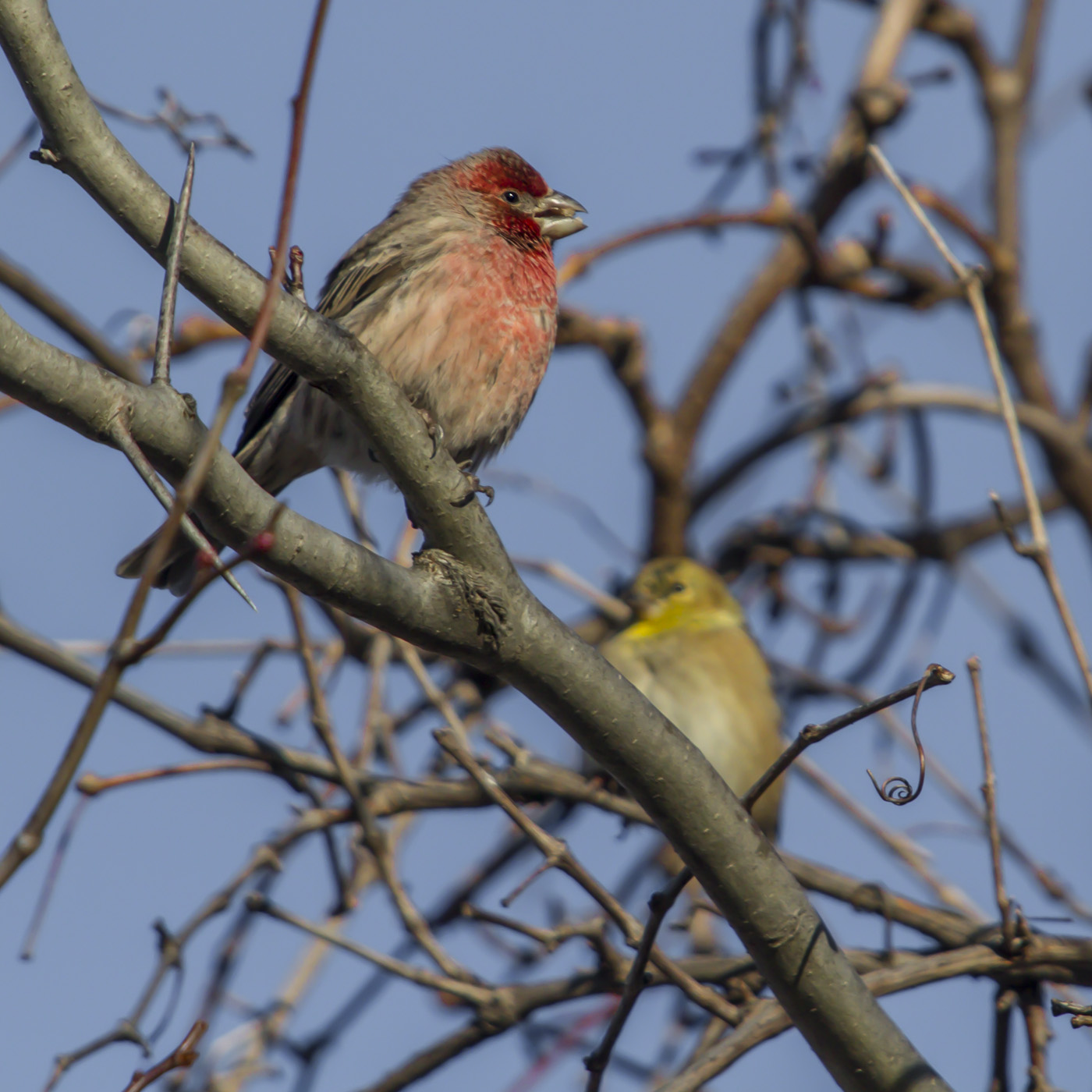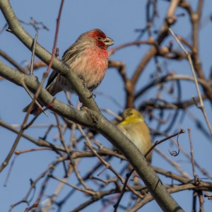 Bon, je vais te donner des trucs pour te simplifier la vie. Le roselin familer est commun chez nous et le roselin pourpré est rare. Ce qui est déjà un bon indice que tu as dû voir des familiers. Si ça ne suffit pas, les femelles peuvent aider (comme toujours). Celle du pourpré a le sourcil blanc près apparent, pas l’autre. Autre chose, le pourpré est plus « baquais » et surtout il a du rose sur toute la tête et la poitrine et un peu les flancs. En gros, on dirait qu’on l’a pris par les pattes et qu’on l’a trempé dans du jus de framboise, juste assez pour ne pas le noyer.