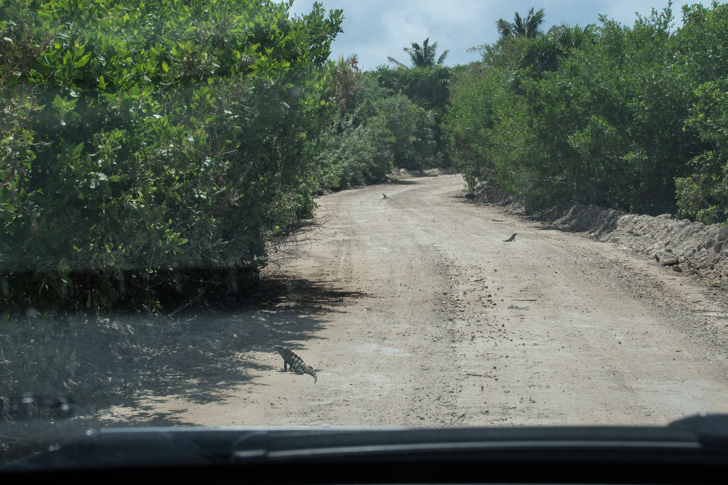 Lorsque l’on prend la route pour Sian Ka’an (zone inscrite au patrimoine mondial de l’Uneso, réserve de la biosphère) il faut être attentif où l’on met les roues. Pendant près de 40 km, la route non goudronnée, est par endroit très défoncée. Mais comme si cela ne suffisait pas, il faut aussi faire attention à ne pas écraser iguana iguana.. La route (piste) grouille d’iguanes. Un vrai slalom très spécial s’impose…
